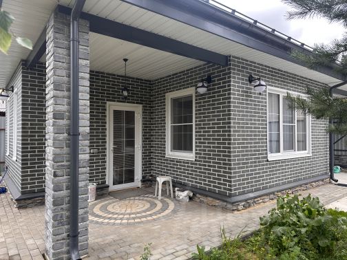 Двухэтажный дом из пеноблока на монолитном фундаменте, фасад отделан облицовочным кирпичом, кровля из металлочерепицы, окна ПВХ.