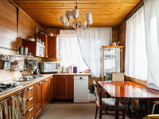 Лестница на металлическом каркасе заводского исполнения, ступени из лиственницы. В доме два входа (входная группа и дверь на открытую террасу из кухни). Остается рабочая кухонная зона с ПММ Bosch (Германия) и другой встраиваемой техникой, холодильник Maytag (США), остальная мебель, верхний свет по желанию.