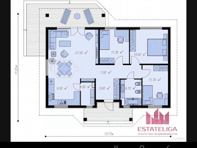 На первом этаже: большие гостиная и кухня, коридор, спальня, санузел, веранда и котельная.