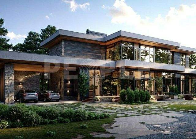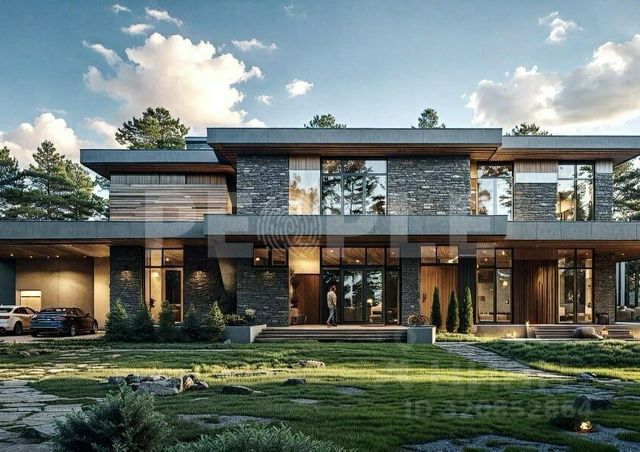 Основной одноэтажный дом площадью 120 кв.м. и высокими потолками (до 6 метров), состоит из 3х спален, 2х санузлов (один из них в мастер-спальне), кухни, совмещенной с гостиной, котельной, мансардным этажом (под кабинет), панорамными окнами. В 2х детских есть небольшой антресольный этаж для уединения с книжкой на мягком пуфе или игр.