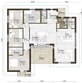 1 этаж: гостиная-столовая (56,2) с выходом на террасу (11,1), кухня (10,8) с кладовой (4), кабинет (21,2), постирочная с душем (12,1), прихожая (5,6), холл (17,2), с/у (2,4).