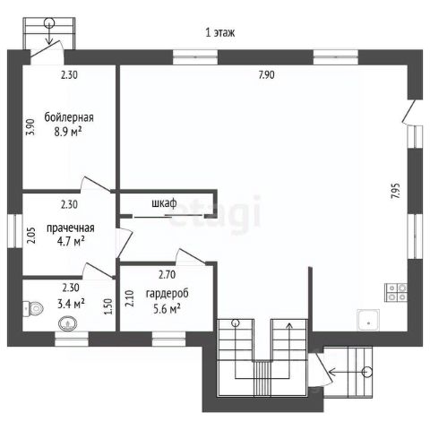 1-й этаж: тамбур (4,7 кв.м), просторный холл (37), гардеробная комната (14,3), кабинет с камином (22,1), кухня-столовая (31,8), гостиная (42,4) с выходом на веранду (31,7) и в сад. В отдельном блоке расположена вторая гостиная с панорамным остеклением (39,2), сауна (4,1), душевая (3,3), гостевой санузел (5,1), котельная (17), кладовая с холодильным и морозильным оборудованием (3,4).