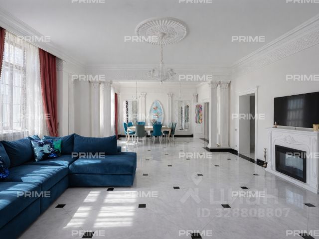 Придомовая территория поражает своей красотой и ухоженностью: среди вывмощенных дорожек возвышаются вечнозеленые ели и сосны, создавая атмосферу приватности в окружении живописного ландшафта. Фасад здания выполнен в классическом стиле с изящной лепниной, колоннами и балюстрадами, что подчеркивает высокий статус объекта.