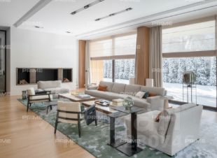 Первый этаж - парадная часть виллы, где утонченный стиль объединяется с функциональностью. Здесь есть все для комфортной жизни: элегантная входная группа со знаменитыми итальянскими светильниками FLOS и дизайнерским круглым столом ANDREAU WORLD гармонично сочетающимися с настенными панелями из эвкалипта. Лаконичный, наполненный светом кабинет с итальянской мебелью от POLIFORM и Meridiani, просторная гостиная с панорамными окнами, авторским камином работы знаменитого скульптора Александра Чичкина, мебелью от Meridiani и PORADA, уютным индийским ковром ручной работы и шикарным видом на окружающие сосны. Столовая со столом от PUNT MOBLES на 10 персон и стульями РОТОССО, с выходом на террасу. Кухня с мраморной столешницей EMPERADOR DARK на острове для уютных домашних завтраков и всей необходимой премиальной техникой: плита, вытяжка, духовой шкаф BERTAZZONI.