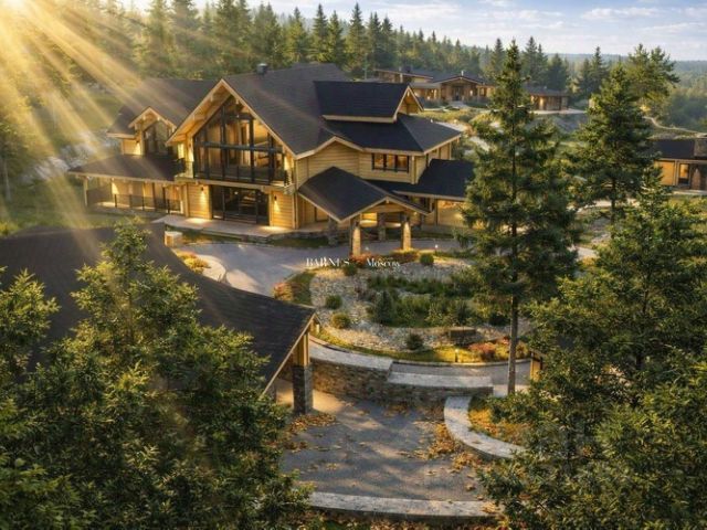 Здесь предлагаются пять готовых к заселению домов — основной дом с проходом в спа-зону и бассейном, дом для охраны с гаражом, два отдельных дома для отдыха и проживания и один домик для отдыха у пруда.