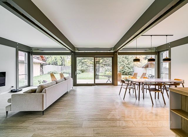 Можно любоваться живописными видами на озеро или пойму реки из зала площадью 70 кв. м с фасадной стеной. Благодаря второму свету с потолками высотой 6 м создается ощущение простора и свободы. Здесь же располагается большой камин с индивидуально выполненными изразцами и летняя открывающаяся терраса с барбекю.