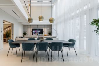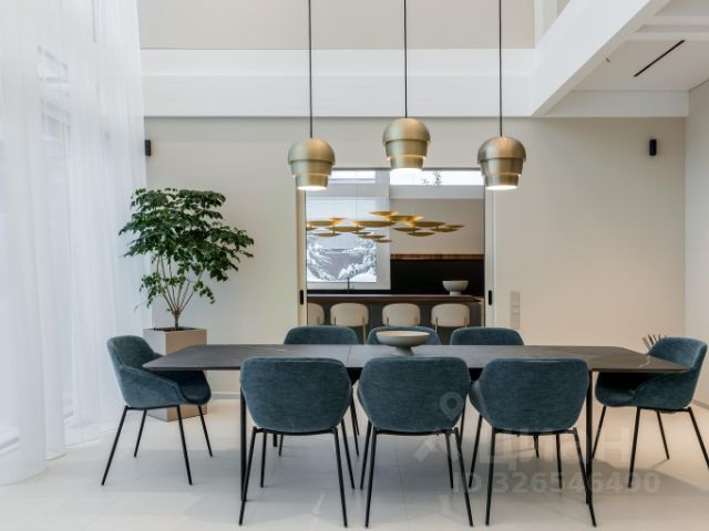 Для максимального удобства на участке построена трапезная. Строение располагается на противоположной стороне озера и включает большой зал, пирс для ныряния, террасы с барбекю и печь. Дополнительно в помещении предусмотрен камин, кухня, санузел и гардероб. Любоваться окружающими пейзажами можно сквозь панорамные окна.