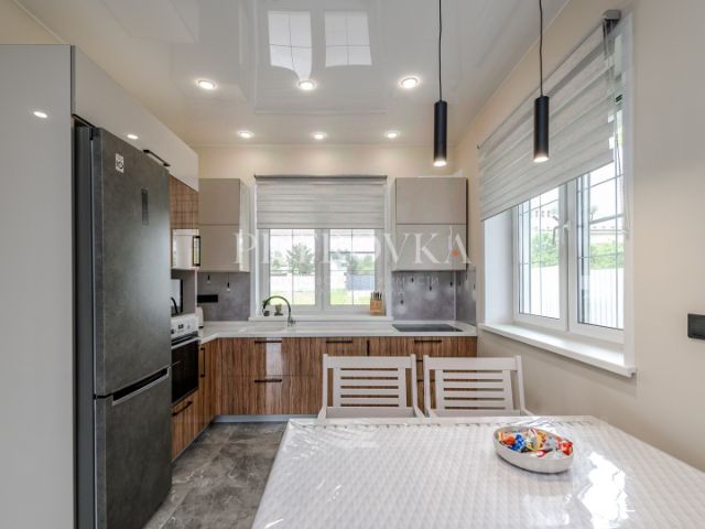Дом для постоянного проживания, из керамзитобетонного четырехпустотного блока 400х200х200 мм, с утеплением 50 мм и облицовкой кирпичом (толщина стен 55 см), строил для себя, не на продажу. В доме гараж, камин, второй свет, теплый пол в столовой и санузлах (водяной), стеклопакеты 2-камерные, бронированные, газовый котел (Германия) Будерус 44 кВт (отапливает дом и баню), септик Топас. Станция водоочистки "Экодар". На первом этаже гостиная и обеденная зона 63 м2, гостевая спальня 16 м2, прихожая 8 м2, санузел 6 м2, гараж 32 м2, котельная 9 м2. На полуторном этаже детская 30 м2 и гардеробная 8 м2. На втором этаже холл 14 м2, спальня 23 м2, кабинет 16 м2 и санузел 12 м2.