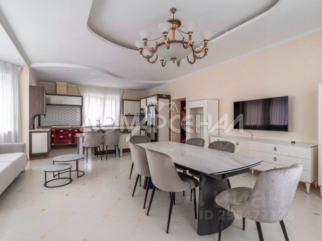 Мебель, оборудование: все комнаты укомплектованы роскошной итальянской мебелью в классическом стиле или барокко. Установлен кухонный гарнитур со столешницей из натурального гранита со встроенной газовой плитой, встроенная духовка и микроволновка BOSH, холодильник LIEBHERR, полубарный остров со столом и стульями 4 шт., обеденная группа из массива дерева. Большое арочное зеркало в холле, телевизоры, диваны, изящные журнальные столики и консоли и комоды. В двусветной гостиной многоярусная хрустальная люстра, окна украшены шторами с ламбрекенами, на полу ковер..