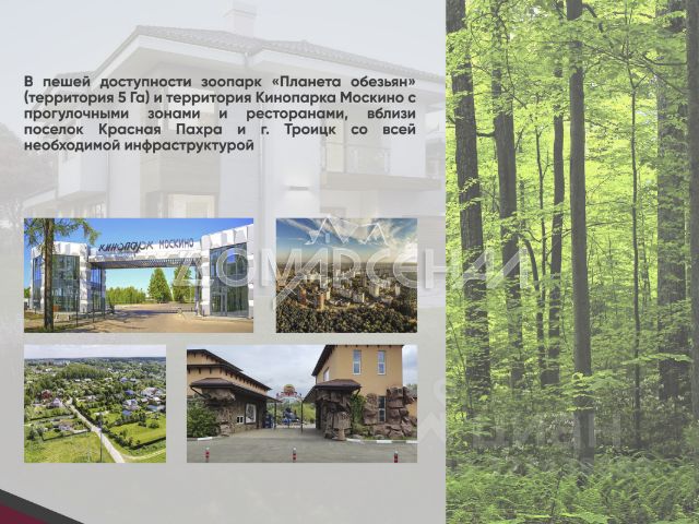 Подъезд - асфальтовая дорога с освещением, с Калужского шоссе, 2 км. В 300 метрах пруд, лес в 100 м. Рядом развязка ЦКАД с Калужским шоссе, 2 км. Деревня находится в тупике, сквозного проезда нет, тихо и спокойно, регулярно ходит школьный автобус в Красную Пахру. В то же время рядом масса развлечений для детей и взрослых: лес, зоопарк, рестораны, кинотеатр, кинопарк, рыбалка! В пешей доступности Зоопарк "Планета обезьян"(1 км), Сафари -парк, Океанариум, кинопарк "Москино" с кинотеатром и рестораном "Чайхона 1", а также знаменитый ресторан "Калужская застава" и рыболовный клуб "Золотой сазан" (2 км).
