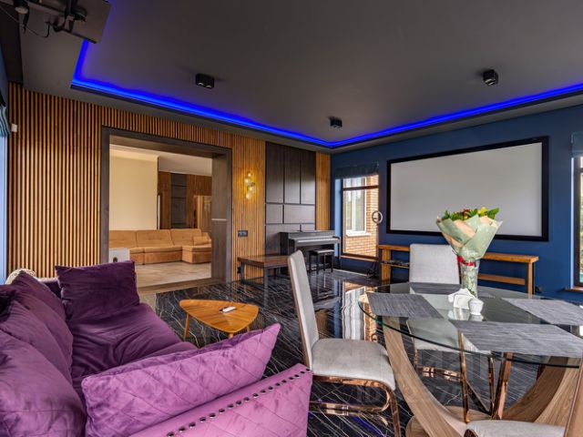 * в доме предусмотрены интерактивные зоны: помещение под КИНОТЕАТР, МАНСАРДНЫЙ ЭТАЖ, где можно разместить бильярдную зону или организовать игровое пространство для детей, БИБЛИОТЕКА.