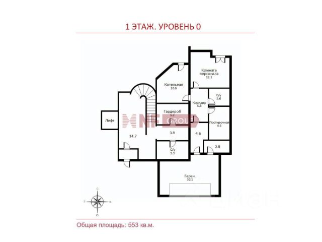 Уровень 1: гараж на 2м/м, комната персонала, с/у, постирочная, котельная, холл-прихожая, гардеробная, с/у;