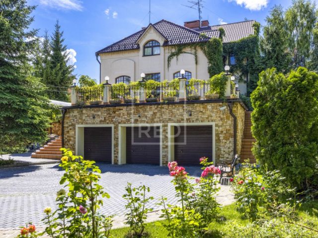 Код объекта в БД Агентства: 316-959. Согласие-1 к/п. Красивый и солидный дом в классическом стиле, с премиальной отделкой и мебелью. На участке также с гараж на 2 автомобиля с квартирой для персонала и домик для приема гостей с теплой отапливаемой кухней-столовой и летней зоной барбекю. В доме эффектная двухсветная гостиная, бильярдная со столом максимального размера, кинозал, сауна с купелью. Шикарный облагороженый участок с множеством взрослых деревьев - плодовых и декоративных. Статусный востребованный поселок с центральными коммуникациями. Материал стен: кирпич. Облицовка стен: фасадная декоративная штукатурка, рустовка углов и окон, цоколь облицован искусственным камнем. Стадия готовности: меблирован. Описание внутренней отделки: выполнена классическая отделка дома с многоуровневыми потолками из гипсокартона, лепниной и большим количеством освещения. В отделке использованы натуральные материалы, мрамор, гранит, коллекционная плитка, на втором этаже ковролин, ламинат. Стены в комнатах покрашены, в санузлах плитка. Лестница железобетонная шириной 1,2 м, ступени из мрамора, с коваными патинированными перилами. Все санузлы укомлектованны необходимой сантехникой: круглая ванная-джакузи, душевые кабины, унитазы, биде, раковины. Все коммуникации разведены под ключ, теплые полы везде, где плитка, розетки и выключатели SIMON, радиаторы KERMI. Межкомнатные двери МДФ, светлые с филенками.. Инженерное обеспечение: в доме установлены котел газовый напольный WOLF, бойлер REFLEX 300 л, многоступенчатая система очистки воды. В каждой комнате кондиционеры Panasonic. Бензиновый генератор VANGUARD (питает весь дом).. Мебель, оборудование: все комнаты укомплектованы роскошной итальянской мебелью в классическом стиле или барокко. Установлен кухонный гарнитур со столешницей из натурального гранита со встроенной газовой плитой, встроенная духовка и микроволновка BOSH, холодильник LIEBHERR, полубарный остров со столом и стульями 4 шт., обеденная группа из массива дерева. Большое арочное зеркало в холле, телевизоры, диваны, изящные журнальные столики и консоли и комоды. В двусветной гостиной многоярусная хрустальная люстра, окна украшены шторами с ламбрекенами, на полу ковер.. Тип участка: с ландшафтом и взрослыми деревьями. Благоустройство участка: облагороженный участок со множеством взрослых декоративных и плодовых деревьев, организована система автополива (9 контуров) по всему участку, вымощены дорожки, газон.Целый яблоневый сад разных сортов, сливы, груши, вишни, черешни... Более 20 туй, клены, каштаны, осины, декоративная береза, множество кустарных растений, круглые туи и 6 рододендронов, можжевельники, лиственница. Пионы и тюльпаны. Кустарники: крыжовники, смородина черная и красная. Организован дренаж по всему участку с выводом в центральную ливневую систему.. Дополнительные строения: - Гараж с квартирой персонала площадью 75 кв.м, кирпичный, в стиле основного дома: 1-ый этаж: гараж на 2 авто, отапливаемый, на 2-ом этаже квартира персонала (с кухней и санузлом); - Домик для приема гостей 73,2 кв.м, капитальный, всесезонный, в стиле основного дома, с отапливаемой частью ок.40 кв.м (отапливается электричеством - теплые эл. полы и конвекторы, окна ПВХ, мягкая кровля), в которой полностью оборудованная мебелью и техникой кухня-столовая, кладовая, гостевой санузел и неотапливаемой