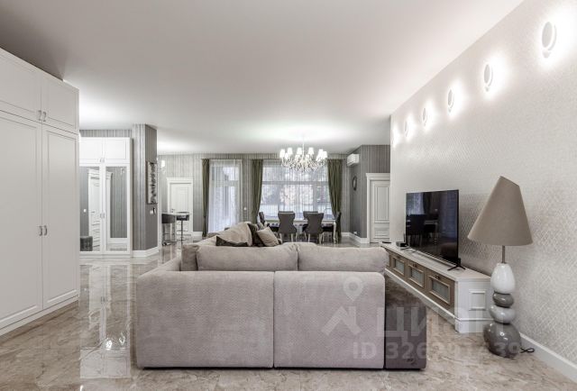 В гостиной — 75 дюймовый экран TV с поворотным механизмом.