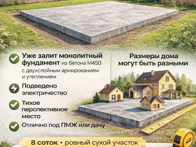 Продается участок 8 соток — готовый фундамент для вашего дома мечты! Ищете идеальное место для жизни за городом в тишине леса, но без ущерба для удобства? Ваш поиск завершен! Ключевые преимущества: Готов к стройке: Ровная, сухая площадка 8 соток. Уже залит монолитный фундамент-плита высочайшего качества (бетон М450, двухслойное армирование, утепление пеноплексом). Экономия вашего времени и бюджета! Идеальная локация: Тихая, сложившаяся деревня с постоянными жителями. Лес прямо за окном — свой зеленый курорт с грибами и ягодами. Отличная транспортная доступность: Всего 40 минут до Москвы на автомобиле. Вся инфраструктура рядом: Школы, детсады, магазины и медцентры в 10 км. До остановки школьного автобуса — рукой подать. Выгодные условия: Участок подходит под семейную ипотеку с господдержкой. Детали о фундаменте (для строителей): Монолитная плита с бетонной подготовкой. Утепление первым слоем — пеноплекс для фундаментов 50 мм. Арматура: два слоя, сетка 20х20 см. Нижний пояс — 14 мм, верхний — 12 мм. Толщина плиты: 360-410 мм. Бетон: марка М450. Почему это выгодно? # Монолитная плита позволяет построить дом как по текущему проекту, так и меньшей площади — с адаптацией под ваши задачи. # Фундамент выполнен в виде монолитной плиты, что даёт гибкость в проектировании: вы можете реализовать как изначальный проект, так и уменьшить площадь дома, сократив бюджет строительства. # Даже если вы планируете дом меньшего размера — это не проблема. Монолитная плита позволяет свободно изменить конфигурацию будущего дома без потери надёжности. Это не ограничение, а наоборот — запас по площади и прочности. Вы не просто покупаете землю — вы приобретаете готовый старт для строительства, проверенных соседей и жизнь в экологически чистом месте без долгого ожидания. Узнайте больше и приезжайте на осмотр! Участок еще в продаже — не упустите шанс создать свой родовой дом в живописном уголке! Звоните!