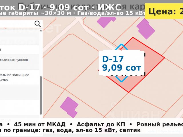 Участок удобно расположен между озером для купания с оборудованным пляжем и озером для рыбалки в тихой части поселка вдали от загруженных проезжих дорог поселка. В этой части поселка находится в т. ч детская игровая площадка, фонтан и корты для игры в гольф, теннис, волейбол, гандбол, футбол и тд . Участок угловой - отсутствуют соседи с двух сторон, можно сделать 2 входа и минигостиницу (одну часть дома сдавать) или парадный вход и для заезда. В окружающем хвойном лесу предусмотрены беседки и зоны отдыха. В 5 и минутах расположены: конная база, бани , SPA с крытым бассейном, рестораны. Регулярно проводятся бесплатные для жителей поселка праздничные мероприятия с угощением, музыкой, катаниями и пр. Всего 45 минут от МКАД по Симферопольскому шоссе или трассе М4-Дон Земли ИЖС. Центральные коммуникации. Единые стандарты строительства Три природных озера с родниковой водой для плавания и рыбалки и обустроеным пляжем. Богатая внутренняя инфраструктура спорта, отдыха и развлечений. Собственная служба охраны "Комфорт Security" и своя обслуживающая компания Участок D-67 на генплане Green Forest Сlub. Фото и больше информации можно увидеть на офиц сайте Green Forest Сlub. Группа посёлков Green Forest - это образец загородной жизни для современного человека, ценящего комфорт, приватность и эстетику. К Вашему участку подходят все центральные коммуникации газ, водопровод, электричество, высокоскоростной интернет и телевидение. Все инженерные сети проходят под землей, что позволяет сохранить первозданный природный облик поселка. В Green Forest нет обязательного подряда на строительство, но соблюдается единый архитектурный стиль ограждения, цвета кровли и фасада домов. Широкие асфальтные дороги, пешеходные тротуары, парки с лавочками и фонтами, оборудованные лесные тропы все это создает ощущение сформированной системы заботы о жителях. Продажа участков ИЖС.