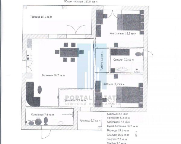 Большие окна, расположенные в различных зонах коттеджа, эффективно освещают помещения и создают уютную атмосферу. Терраса площадью 27,3 кв.м. представляет собой идеальное место для отдыха и проведения времени на свежем воздухе.