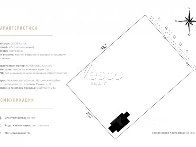 Также на участке расположен деревянный дом с цокольным этажом, к которому уже подведено электричество. Всего выделено 50 кВт электроэнергии.