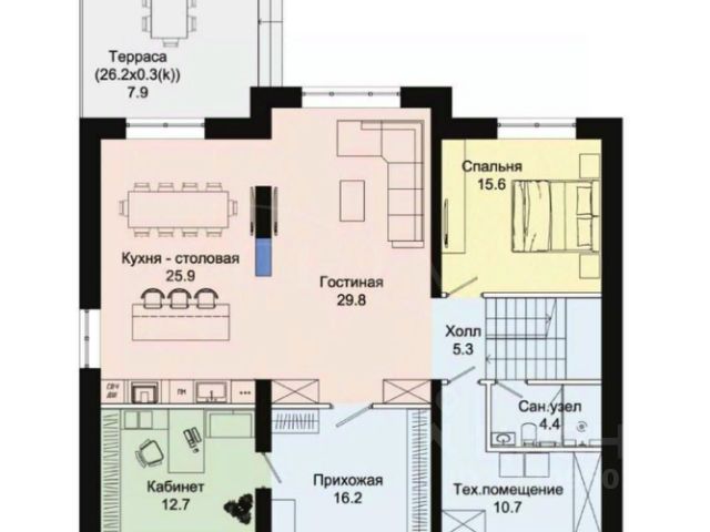 1 этаж: холл, кабинет, камин - 2шт., санузел, кухня, гостиная, зимний сад, патио