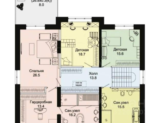 2 этаж: холл, детская спальня, санузел, гардеробная