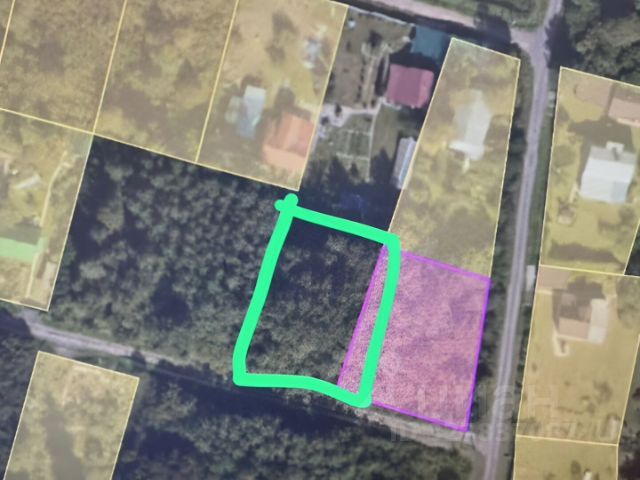 На общем фото выделила участок цветом, но фото старое, на текущий момент на территории много деревьев и застройка поселка практически закончена.