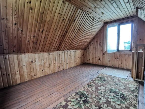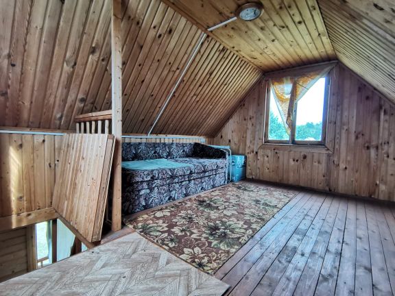 Дом брусовый 6 на 6 метров, на столбчатом фундаменте, на первом этаже которого уютная веранда 13,9 квм, и большая комната 25,6 квм, с печью. На веранде установлена лестница на второй мансардный этаж, площадью 22,3 квм. Дом очень теплый, печь его легко обогревает. В подполе обустроен большой глубокий погреб.