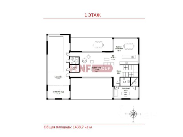 Цоколь: холл, SPA зона: зона отдыха, бассейн 48 кв.м., парная, санузел, душевая; тренажерный зал, постирочная, бойлерная, гараж на 2 авто 52 кв.м.