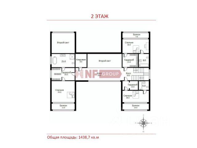 2 этаж: холл, мастер-спальня с гардеробной, ванной комнатой и террасой, спальня с лоджией, две спальни с общей террасой, санузел.