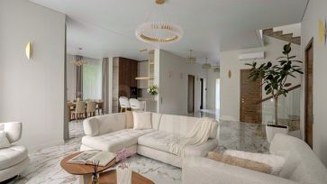 Описание внутренней отделки: в доме выполнена стильная современная отделка под ключ с использованием элитных материалов. Стены оштукатурены, окрашены матовой моющейся краской Sherwin-Williams (США). На полу в жилых комнатах - инженерная дубовая доска LuxuryTree, Дуб Кавказский, Селект-Прайм, покрытая матовым лаком Silver Grey, на кухне и в санузлах крупноформатный ректифицированный керамогранит PORCELANOSA (Испания) и керамогранит ITALON (Италия). Установлены внутрипольные конвекторы с эффектными деревянными решетками. Потолки отделаны гипсокартоном на профиле, окрашены. Установлен биокамин LuxFire (Россия), выполнено качественное встроенное и трековое освещение (Стильный Свет, Россия). На второй этаж ведёт широкая удобная монолитная лестница, ступени из инженерной доски со шпоном дуба, ограждение из закаленного осветленного стекла (Crystalvision - Япония). Установлены двери современного дизайна скрытого монтажа, окрашенные в цвет стен, подоконники из кварцевого агломерата, розетки и выключатели EFAPEL (Португалия).