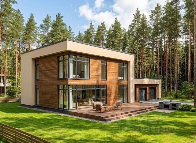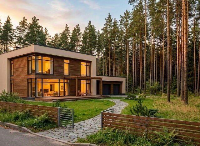 На фотографиях — визуализация того, каким он может быть. Современный дом среди сосен, терраса с видом на лес, тёплый свет зимним вечером. Это не фантазия — это то, что реально помещается на 15 соток с ГПЗУ на 588 квадратов. Листайте и примеряйте на себя.
