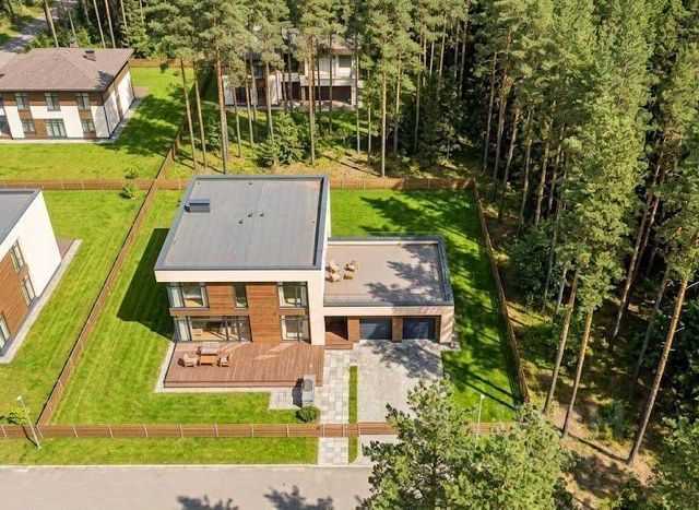 КП Сосновый Бор. Название не врёт — он реально стоит в сосновом бору, на берегу реки. Бизнес-класс. Заселённость 70% — это значит, что посёлок живой: соседи есть, дороги чистят, площадки работают. Но при этом нет ощущения муравейника — не 300 домов на пятачке, а простор, воздух и лес через забор.