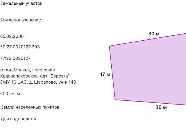Эксклюзивное предложение для тех, кто стремится построить свой дом в уникальном месте! Предлагается к продаже идеальный участок земли площадью 6 соток, расположенный в деревне Секерино. !!!ПРОПИСКА МОСКВА!!! Административный адрес: г. Москва, вн.тер.г.поселение Михайлово-Ярцевское, деревня Секерино. Удобный выезд на Калужское или Киевское шоссе. Этот участок уникален тем, что находится всего в 17 км от Московской кольцевой автомобильной дороги (МКАД) по хорошо прокладываемому Калужскому шоссе, что обеспечивает прекрасную транспортную доступность. Категория земель указывает на земли поселений, что открывает владельцам возможности для воплощения своих жилищных проектов. Земля предназначена для садоводства, при этом на ней разрешено строительство жилого дома с возможностью официальной регистрации по месту жительства (Московская прописка) Участок имеет идеальные геометрические характеристики ровный и сухой, общей площадью 6 соток. Уже сегодня на участке имеется небольшой хозяйственный блок (входит в стоимость), который хоть и не зарегистрирован, может использоваться для хранения инструментов и материалов в первые этапы строительства. Вокруг - множество ухоженных участков, принадлежащих ответственным владельцам, многие из которых живут здесь круглый год, что гарантирует благоприятную и безопасную среду для жизни. Коммуникации уже на месте: по границе участка проходит магистральный газ, а электричество в количестве 15 кВт уже подведено, что значительно упрощает процесс организации жизненно необходимых удобств в вашем будущем доме. Забор из профнастила, заезд на участок асфальтирована. Рядом, в 100 метрах лес и река Пахра. Тихое , спокойное место для летнего отдыха. Неподалёку находится посёлок Шишкин Лес.В посёлке имеются школа, сады, магазины, банк и т.д. Так же остановка общественного транспорта в Москву располагается в 5 минутах. Автобусы ходят через каждый 10 минут. Этот участок - идеальный шанс для осуществления мечты о собственном доме в живописном, но при этом легко доступном месте.