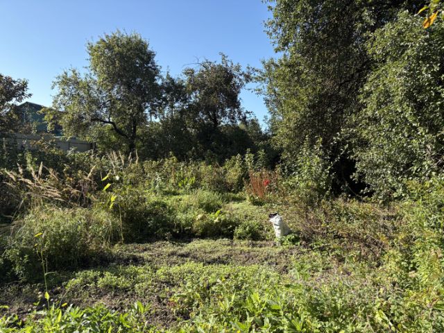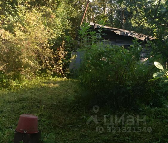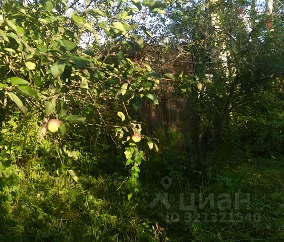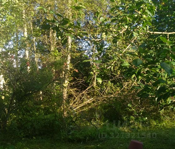 Участок в обжитом СНТ, много зелени, вокруг лес. Забор с 3 сторон - профлист и рабица, подведено электричество. В СНТ протекает ручей, есть пожарный пруд. На участке стоит мет.контейнер под инвентарь, дощатый сарай под снос. По углам участка высокие березы, вдоль забора высажены кусты калины и тёрн, растет яблоня.