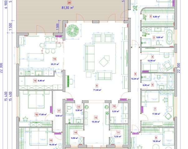- На 2-ом этаже: мастер-спальня; гардероб и ванная комната; подростковая спальня со своим гардеробом и своей ванной комнатой; гостевая спальня (по проекту спорт зал) с гардеробом; холл; второй свет.