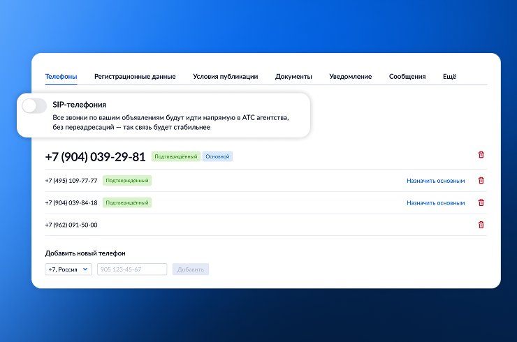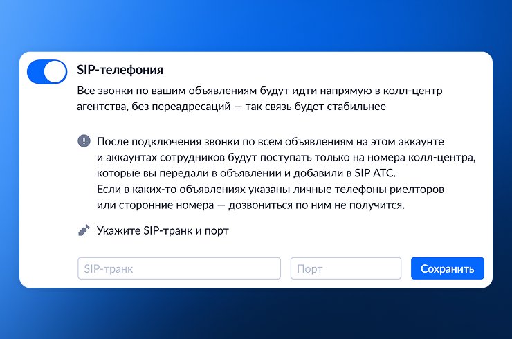 SIP-телефония подключается ко всем объявлениям, размещённым через аккаунт агентства недвижимости.