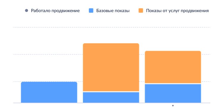 Оцените точный эффект от продвижения в прозрачной статистике показов объявлений. Данные разделены: вы видите периоды с подключенным продвижением и просто базовые показы.