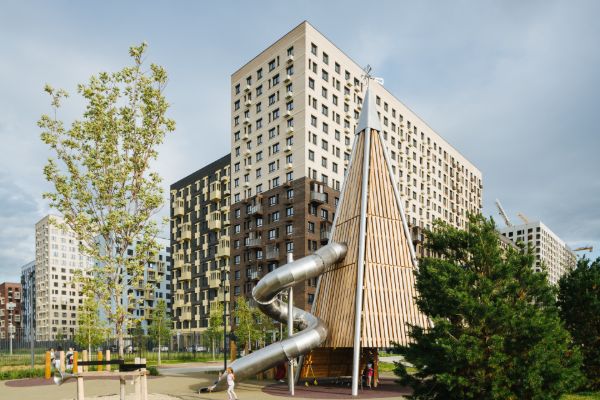 Многоэтажные дома, с открытыми внутренними дворами вписаны в общую зеленую зону и объединены с существующим ландшафтным окружением в единый природный комплекс. Пластика разноэтажной застройки (от пятнадцати до двадцати пяти этажей), с включением объемных разноуровневых элементов, создает ощущение плавного контура городской застройки и подчинена созданию образа многообразной и масштабной городской архитектуры.