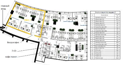 Желтый сектор на планировке. Состав помещений блока 102 кв м: опен спейс 80 м.кв. 2 отдельных кабинета (10-11 м.кв), отдельная серверная и гардеробная, отдельный вход в офис. 1 отдельный санузел. Вместимость 16 сотрудников.