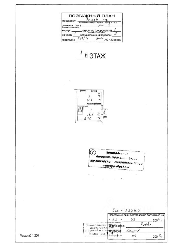 Первый этаж девятиэтажного жилого дома. Общая площадь 38,2 кв.м. 1 комната, сан. узел, 2 телефонных линии МГТС, электричество 25 кВт.