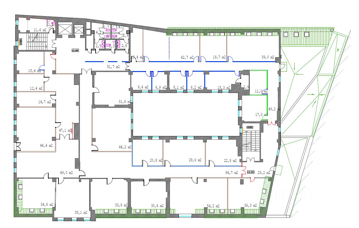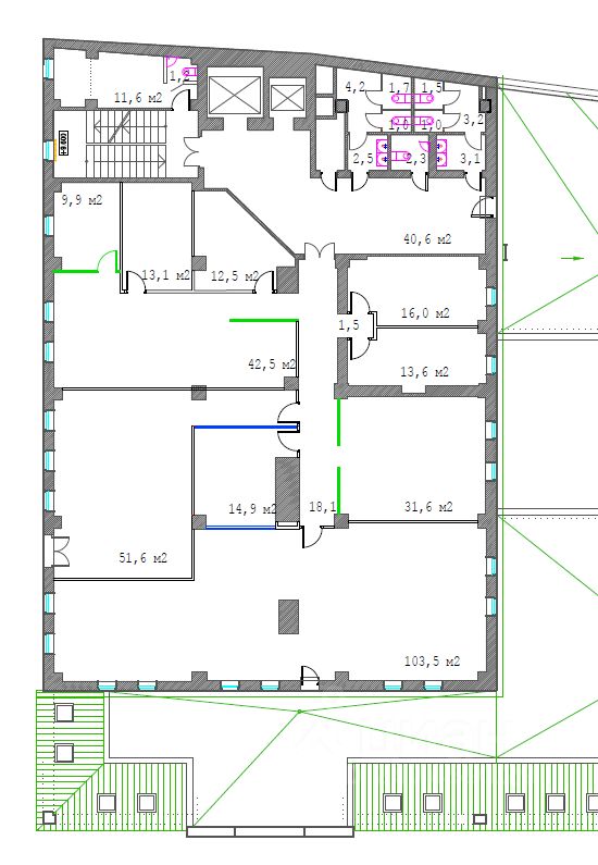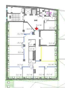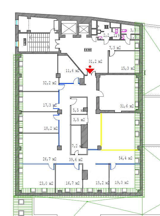 - 6 этаж - 424,6 кв.м. Кабинетная планировка. 3 с/у, кухня, серверная. Рассадка до 45 сотрудников. С НДС.
