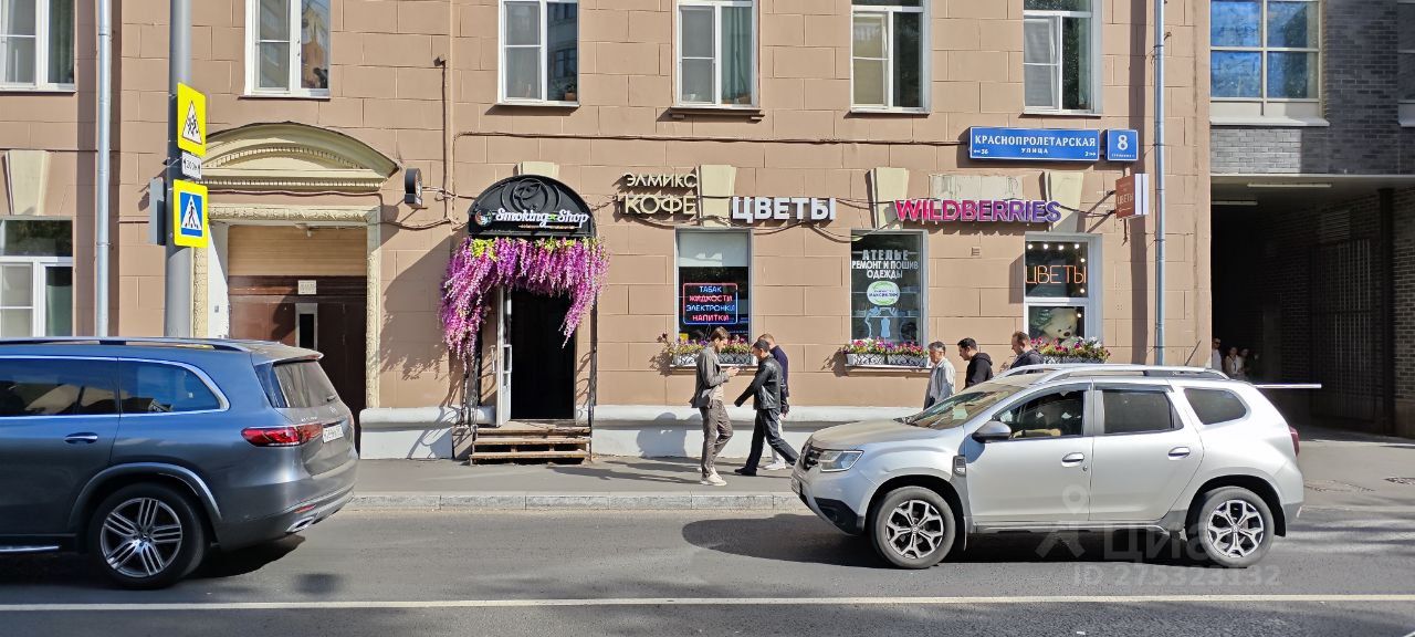 Вход с первой линии, возможность вывески, витрина, возможна мокрая точка. Интенсивный пешеходный трафик, парковка. Высокая плотность офисов и жилых домов, рядом остановка общественного транспорта, садовое кольцо, огромный офис билайна вплотную. Соседство с WB, цветы, кофе, ателье