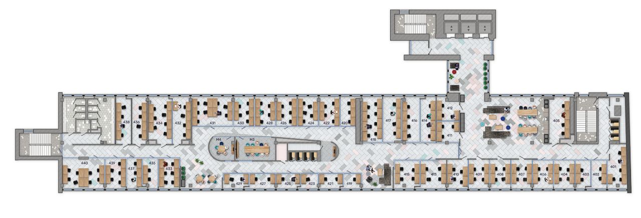 Офисное пространство имеет эффективную планировку на 162 рабочих места, переговорные, мягкие зоны для отдыха и общения, кухни со встроенной техникой, телефонные кабинки для индивидуальной работы, готовая серверная.