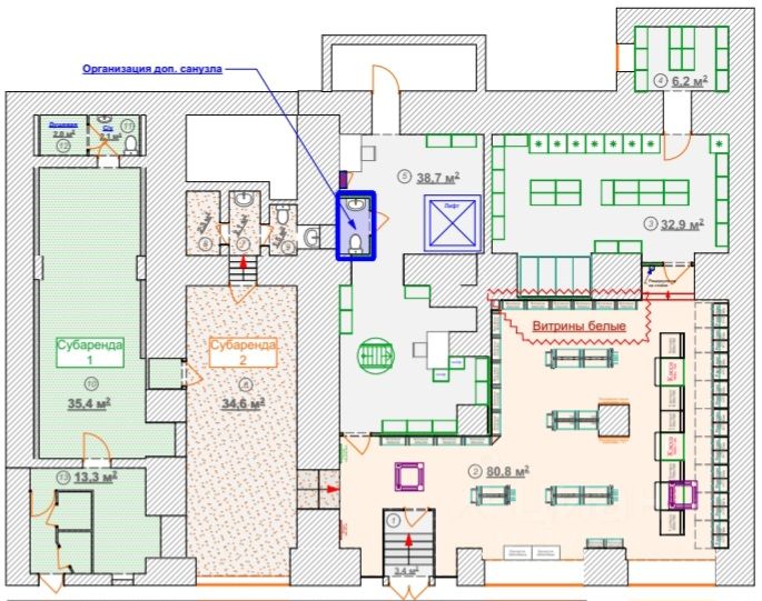 Сдаётся нежилое помещение 46,81 кв м (на схеме помещение слева - субаренда 1).