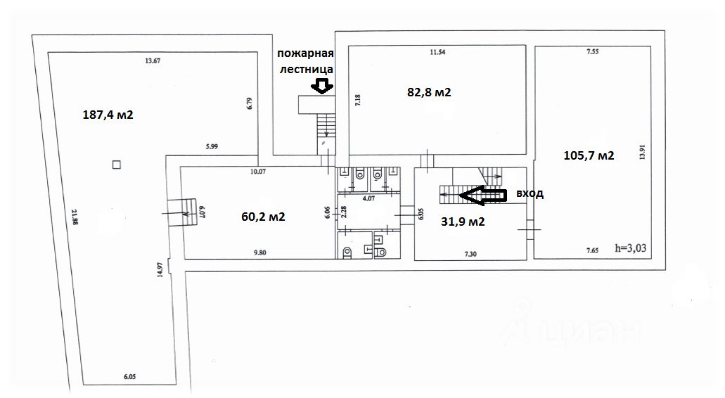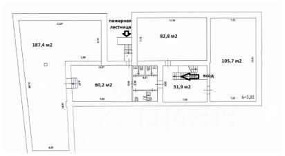 Планировка зальная: 187,4 м2, 82,8 м2, 105,7 м2, 60,2 м2, 31,9 м2. Достаточное кол-во с/у.