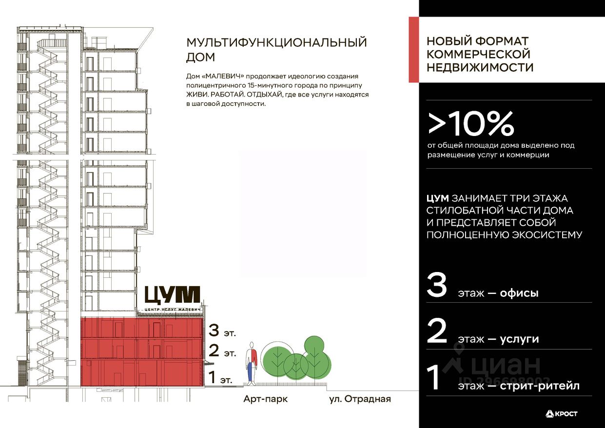 Аренда торгового помещения площадью 53,0 кв.м. от застройщика в уникальном проекте ЦУМ (Центр Услуг Малевич) - широкоформатный и мультифункциональный кластер услуг, интегрированный в жилое пространство Дома "МАЛЕВИЧ", который находится в сердце густонаселенного района Отрадное.