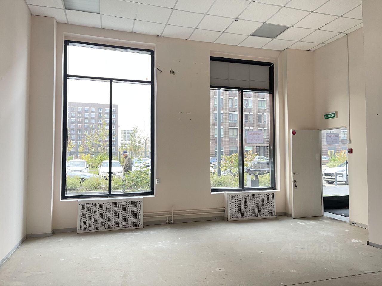 Окна помещения выходят на улицу со школой, детским садом. Входная калитка в жилой комплекс, парковочные места.