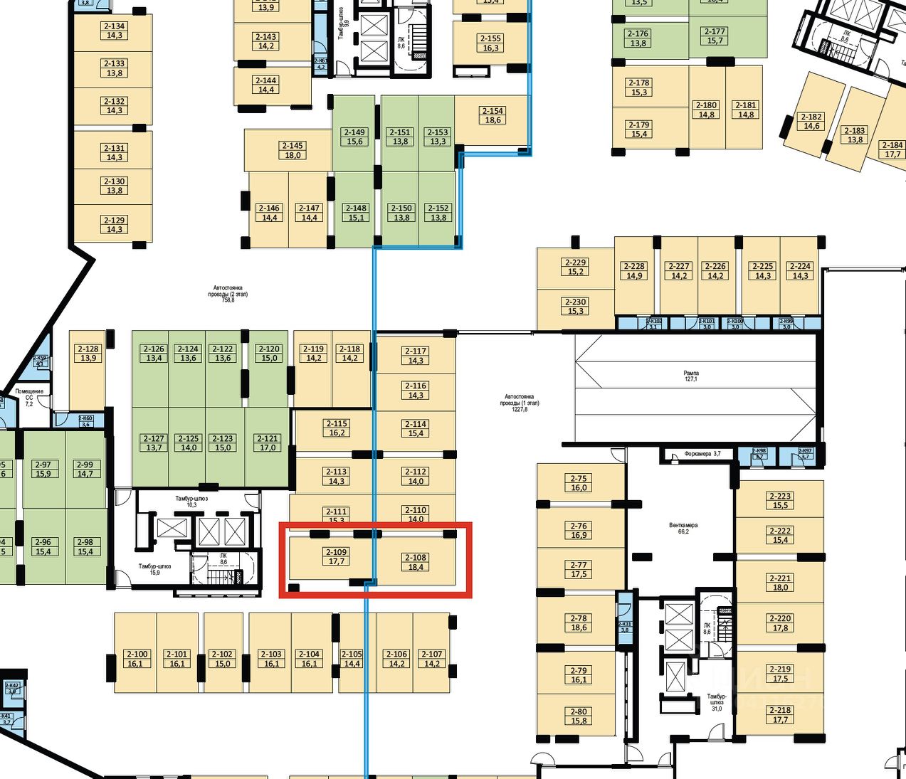 Машино-место на 2 автомобиля 35,8 м2 с удобным заездом и посадкой. На плане 2-108/109 фактический 83/84. Стоимость указана за оба мм, включает в себя эксплуатацию (порядка 8 тыс. в месяц).