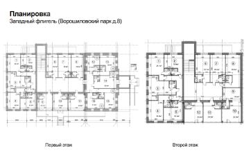2. Западный флигель, Ворошиловский парк 8, общая площадь здания: 1586 м2, в том числе: площадь подземной части - 630 м2, площадь 1 этажа - 555 м2, площадь 2 этажа - 400 м2.