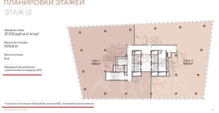 12-13 этажи 500-2110кв.м - видовые этажи с потолками 6 м и антресолями с увеличением площади до 40%.