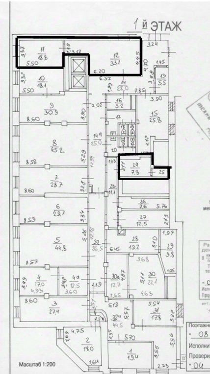 комнаты 11 (площадь 18,8 кв. м.), 12 (площадь 33,1 кв. м.), 24 (площадь 7,8 кв. м.), 25 (площадь 1,9 кв. м.). Общая площадь 61,6 кв. м.